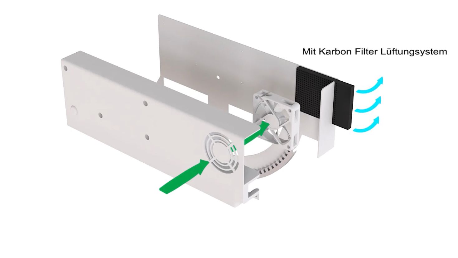 Schluss mit unangenehmen Gerüchen! Der Aktivkohle-Filter in Kombination mit dem Lüftungssystem neutralisiert unerwünschte Gerüche effektiv und sorgt für ein frisches Raumklima.